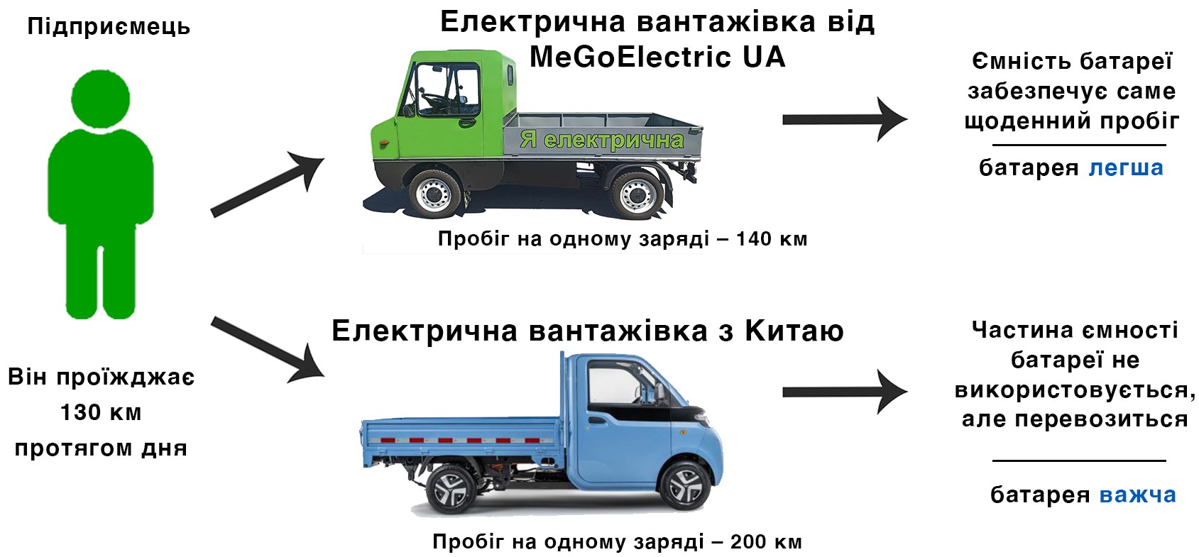 Наприклад, підприємець проїжджає не більше 130 км в день, а пропоновані на ринку моделі мають запас ходу на електриці не менше 200 км. Купуючи таку модель з китайського заводу, ФОПу доводиться сплатити за ємність батареї, якою він не користується, а й ще постійно возити її з собою.